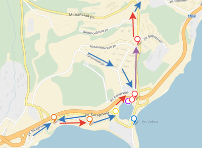 Система канализации в новом микрорайоне у бухты Патрокл во Владивостоке показана на схеме выше. Синие стрелки - это самотёк, то есть спуск канализации под естественным уклоном, а красные - путь наверх с помощью насосов. Часть домов на набережной Патрокла собирают канализацию в точке рядом с новым ЖК "Восточный бриз Премьер" и оттуда закачиваются в верхнюю точку набережной. Затем потоки спускаются по трубам к озеру и оттуда поднимаются к КНС-1 (канализационная насосная станция) в северозападном углу над озером у авторазвязки. Потоки с улицы Сочинской спускаются туда же. Затем от КНС-1 должно быть прокачка до следующей КНС-2 рядом с верхним заездом на район от улицы Борисенко.