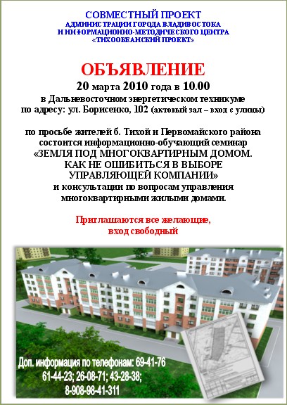 ![]() СОВМЕСТНЫЙ ПРОЕКТ АДМИНИСТРАЦИИ ГОРОДА ВЛАДИВОСТОКА И ИНФОРМАЦИОННО-МЕТОДИЧЕСКОГО ЦЕНТРА «ТИХООКЕАНСКИЙ ПРОЕКТ» ОБЪЯВЛЕНИЕ 20 марта 2010 года в 10.00 в Дальневосточном энергетическом техникуме по адресу: ул. Борисенко, 102 (актовый зал – вход с улицы) по просьбе жителей б. Тихой и Первомайского района состоится информационно-обучающий семинар «ЗЕМЛЯ ПОД МНОГОКВАРТИРНЫМ ДОМОМ. КАК НЕ ОШИБИТЬСЯ В ВЫБОРЕ УПРАВЛЯЮЩЕЙ КОМПАНИИ» и консультации по вопросам управления многоквартирными жилыми домами. Приглашаются все желающие, вход свободный Дополнительная информация по телефонам: 69-41-76; 61-44-23; 26-08-71; 43-28-38; 8 908 98-41-311