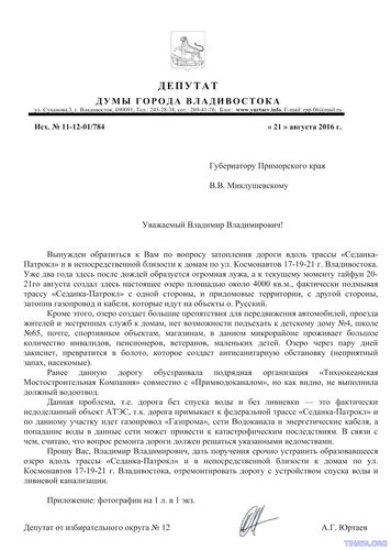 Рядом с домом Космонавтов 17 на Бухте Тихой в связи с отсутствием ливнёвок, уже традиционно скапливаются вода после дождей, которой некуда уходить, так как отсутствуют, какие либо сточные коммуникации .И поэтому она там стоит пока не высыхает.А высыхает она долго, над водой уже летают насекомые,скоро лужа превратится в болото.